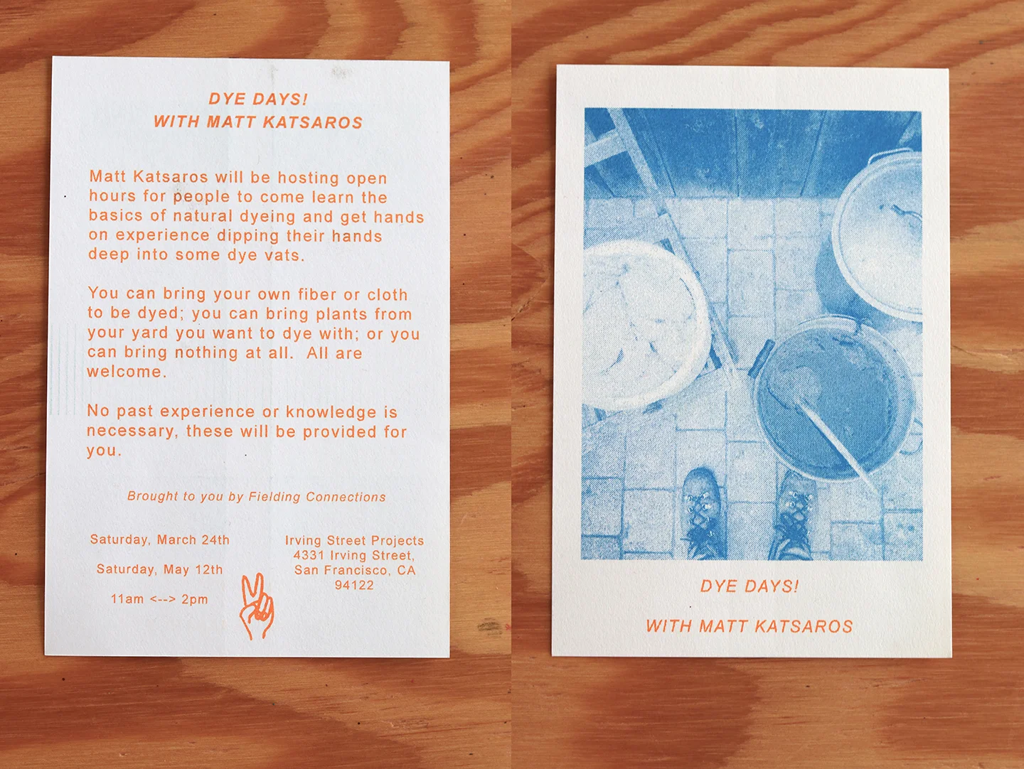 Matt Katsaros will be hosting open hours for people to come learn the basics of natural dyeing and get hands on experience dipping their hands deep into some dye vats.